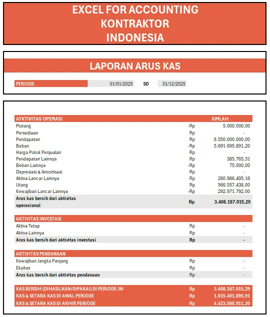 - Aktivitas Pendanaan: penerbitan saham, pinjaman, pembayaran dividen.
