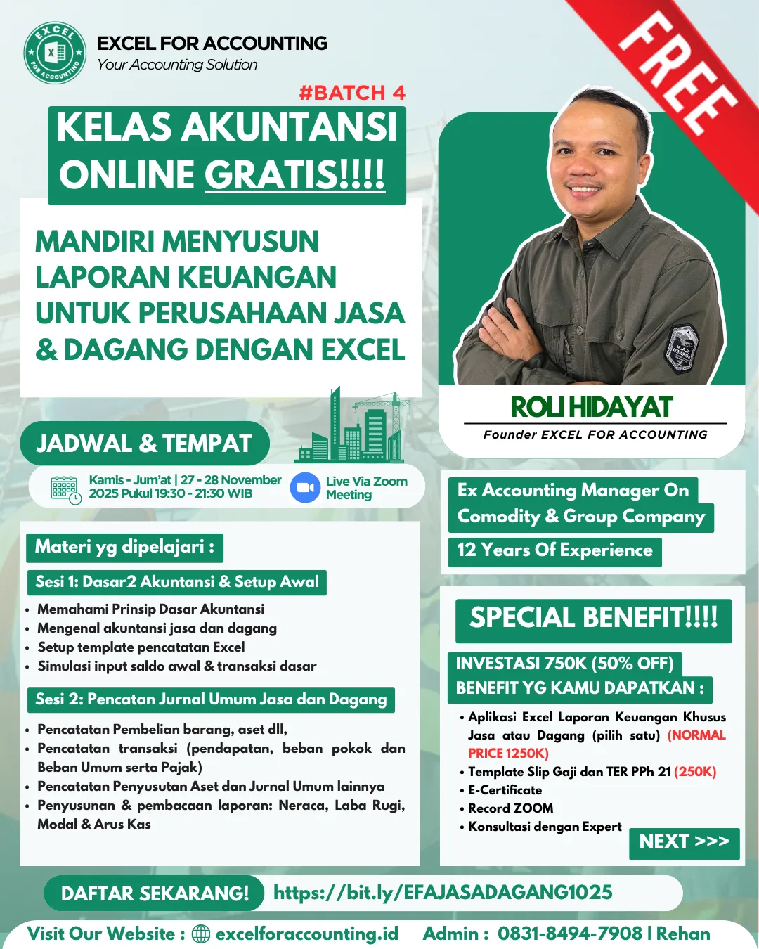 💡 Ikuti kelas akuntansi online “Mandiri Menyusun Laporan Keuangan Usaha Jasa & Dagang dengan Excel” bareng praktisi berpengalaman! SECARA GRATISS!!!!